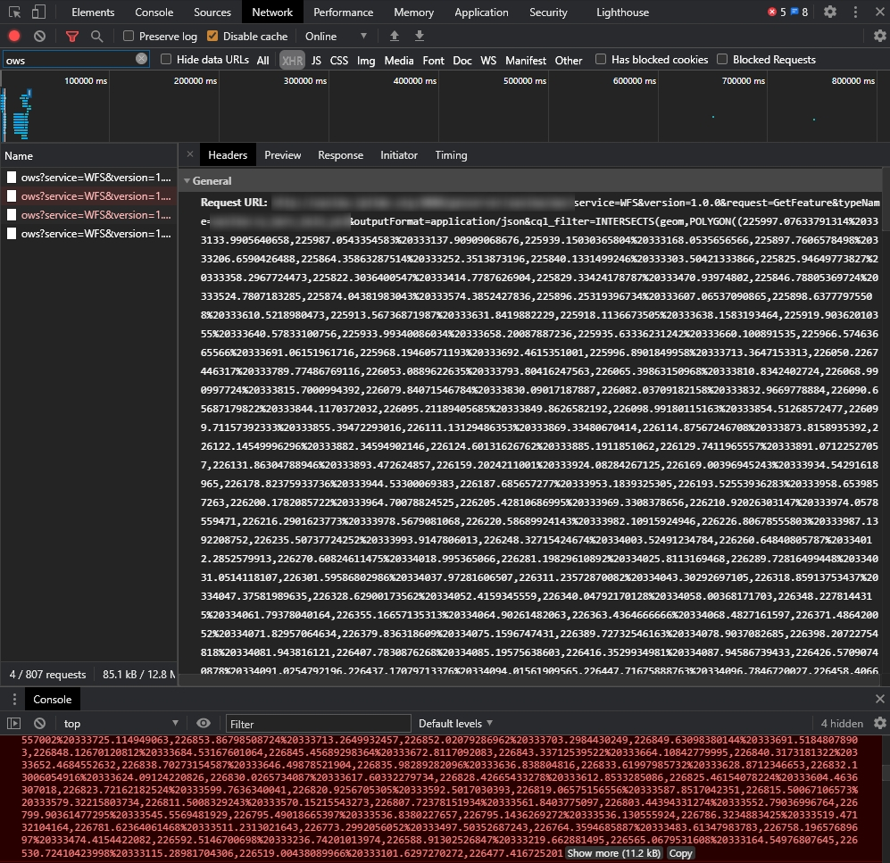 현재 기능에서 해당 에러가 발생한 원인은 CQL_FILTER를 적용하면서 도형정보(POLYGON(coord1,coord2.....))가 입력되는데 도형의 좌표값들이 많아지다 보면 URL의 최대값을 넘어버리는 경우가 생기는 모양이었다.