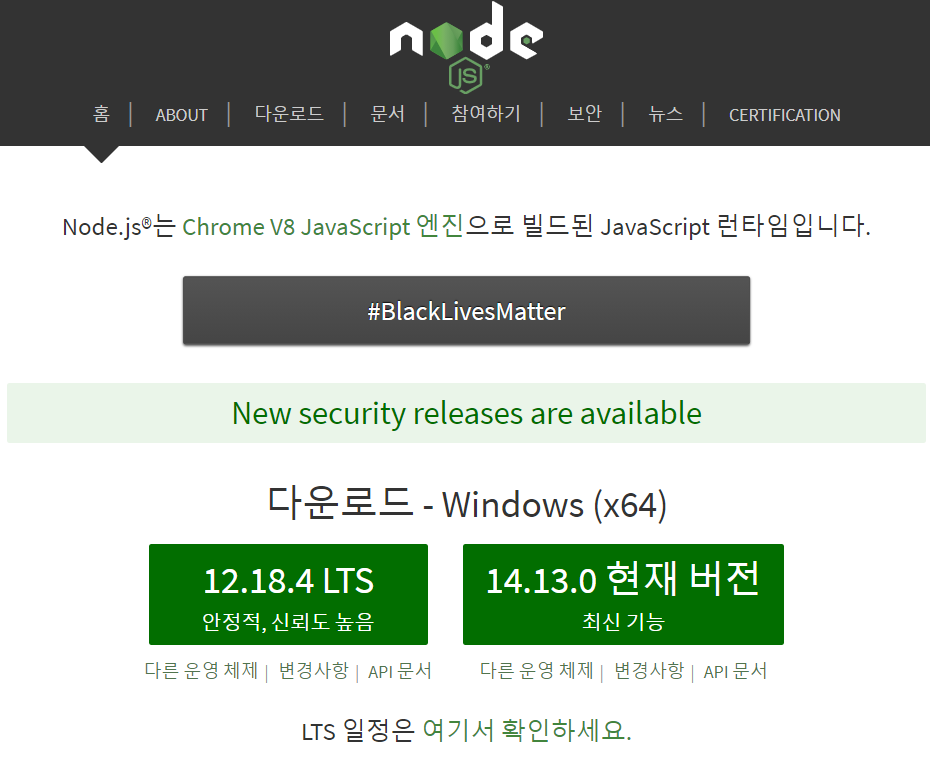 구글에 nodejs를 검색해서 nodejs 공식 홈페이지에 들어가거나 아래 링크를 통해 접속한다.